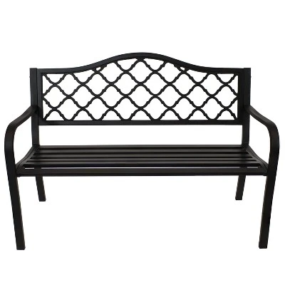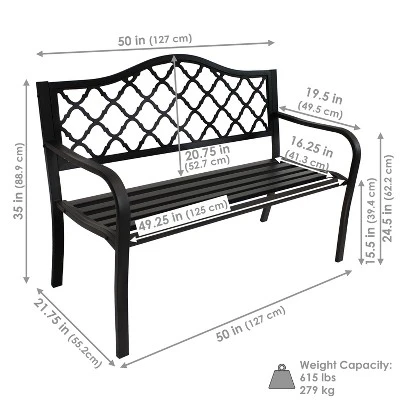 This durable cast iron outdoor bench with a lattice back design can seat up to 2 people, thus making it a great piece for any garden, backyard, entryway, or sunroom to enjoy conversation with a loved one. The contemporary bench frame is sleek, clean, and complements any outdoor furniture with a modern outdoor aesthetic. Weighing only 32 lbs, the outdoor garden bench can easily be moved to any desired location while remaining durable to the elements outdoors. With a weight capacity of up to 615 lbs, 2 people can enjoy many conversations while relaxing on this black, cast iron, lattice back patio bench. Create a comfortable and classy place to unwind at the end of a long day outdoors with a friend, partner, or pet. Enjoy reading a book, drinking morning coffee, or simply relaxing anywhere outdoors in style and with ease on this bench.