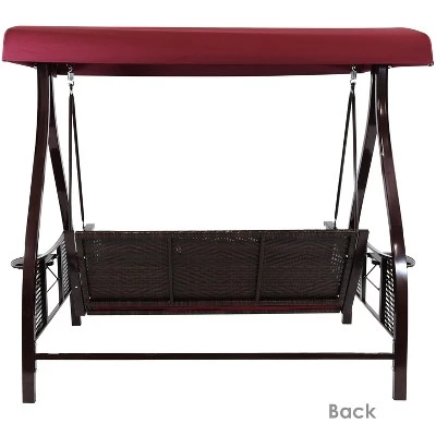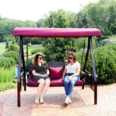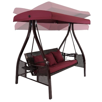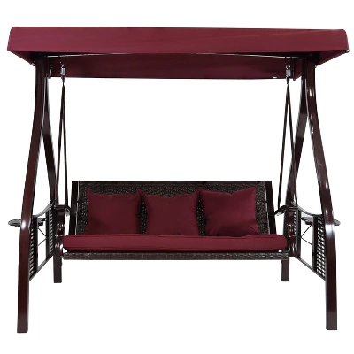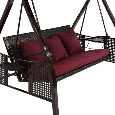 Enjoy the shade on your porch or backyard with this outdoor 3-person, steel patio, swing featuring side tables and a comfortable canopy. Featuring a steel metal frame and rattan swing, this outdoor lounger is resistant to the elements and is sure to last for years to come. The side tables on either side provide convenient spots to place drinks, snacks, or your favorite book. Plus, these plastic trays are a handy place to set down a magazine or mobile device and can be folded down when not in use. The comfortable cushion and pillows make it easy to curl up on the seat to enjoy a good book or conversation with friends or family. The durable steel frame has a powder coating that protects it from most weather conditions. The canopy is adjustable, allowing you to keep yourself shaded on hot, sunny days. Place this swing in your yard and relax with ease.
