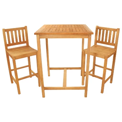 Enjoy drinks and a delicious meal on the patio with friends on a warm sunny day with this simple yet sophisticated high-top bar table and chairs set for 2. This classic set includes 2 bar stool chairs and an extra tall bar table and will complement a variety of decor and furniture styles. Made from durable teak wood with an elegant teak oil finish, this set can be used indoors or outdoors and is built to last season after season. This stylish bar-height outdoor table and chairs set is a wonderful addition to the patio, backyard, basement bar, or deck. The chairs have a weight capacity of 100 lbs while the table can support up to 100 lbs. Plus, this set is simple to put together. All of the tools and hardware required for assembly are included. Cover the set or store the furniture pieces indoors when not in use to help extend the set’s product life.