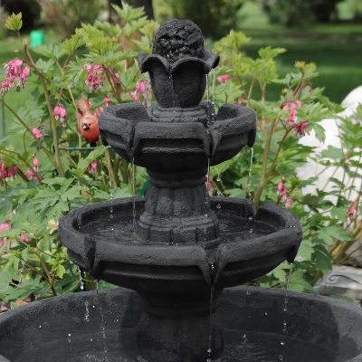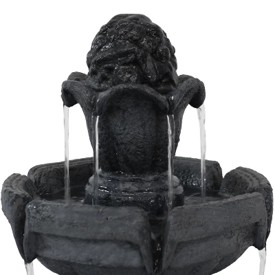 Add elegant appeal to any lawn or garden with this tiered outdoor water fountain featuring 3 tiers and a budding design motif. Great for a patio, this water feature provides a decorative Old-World touch with its stone-like appearance and traditional, large basin bowl. Relax on a summer day and listen to the water as it streams down the decorative finial down the tiers below in multiple, subtle, elegant streams. Constructed of durable and lightweight polyresin, this fountain has the look of stone but is easy to clean, maintain, and place anywhere. The finial features beautiful shapes of delectable fruit. Setup is easy, with the included submersible electric JR-450 pump that stays quiet so that the waterfall sounds can expand. Place in your yard, garden, or other landscaping to fully immerse this beauty in your home and outdoor space. Simply place in your ideal location, fill the bottom basin with water, plug in to the nearest electrical outlet, and watch your space transform with a beautiful focal point and soothing soundscapes.