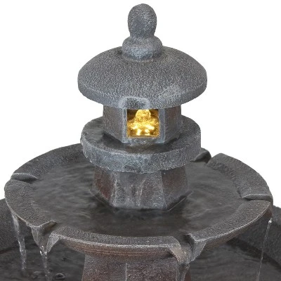 Make this beautiful, multi-tiered, pagoda style fountain featuring LED lights the centerpiece of your garden or patio. Made of lightweight polyresin, this fountain has a durable construction and the appearance of natural stone for long-lasting elegance. Polyresin is easy to maneuver wherever desired with its lightweight material and is also easy to clean. You will love the soothing sounds produced by the water streaming from tier to tier in small, elegant waterfalls for a fun visual feature. This Asian-inspired fountain has a unique pagoda-like design that will add a touch of style to any space. The water will be circulated through the fountain thanks to an electric submersible pump. No plumbing is required for installation. Simply set this fountain wherever desired, fill the bottom basin with water, plug in to your nearest electrical outlet, and transform your outdoor area with soothing sounds. Turn on the LED lights at night to enjoy in the evening.