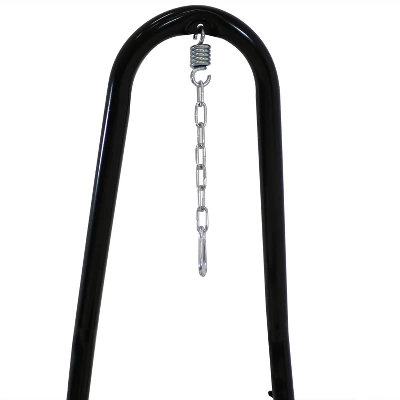 Add the ultimate relaxation source to the garden, patio, or yard with these hanging hammock chairs with an included stand. The included hammock chair stand features a linear design that offers greater stability than that of a traditional C-stand because of the structural support offered by the arch shape, powder-coated tubular steel construction, and the durable plastic stabilizing feet. The hammock itself is made with polyester fabric that keeps your hammock durable against mild/harsh weather conditions while remaining soft and comfortable. The swinging chair stand is height-adjustable from 79″ to 93″ tall which makes it easy to hang the hammock swing at a comfortable height. This hammock chair and adjustable stand set comes with everything needed for assembly to use right out of the box. Place on your patio or deck for easy access to the indoors, or place under a beautiful tree canopy in your yard to enhance your relaxation experience effortlessly.