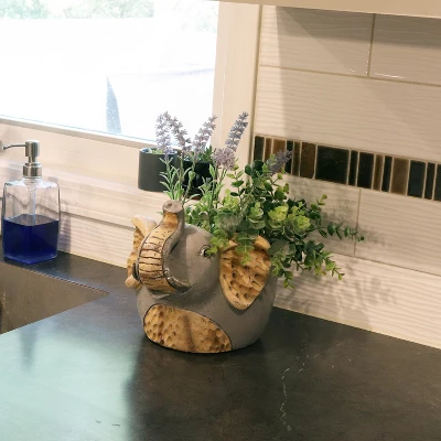 Give a favorite succulent, small plant, or faux plant a home with this little elephant statue planter. The elephant planter statue is designed for placement indoors on desks, tables, and shelves, or in covered areas outdoors like a porch or beneath a balcony. There are endless places to put your new, beautiful, classic, and lively feature! The flowerpot is not easily prone to break, crack, or lose its color easily despite unexpected wear. Its magnesium oxide (MgO) construction and hand-painted finish makes the sculpture beautiful, strong, and easy to maintain. The neutral color scheme is sure to complement any other outdoor or indoor decor or furniture effortlessly. This adorable little elephant features neutral gray and faux wood patterns that are sure to complement any color schemes already existing in your yard, patio, or living space. With a curly nose, textured ears, accented husks, and a wide pot for beautiful plants, this little elephant will quickly become a family favorite!