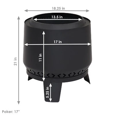 - • GREAT FOR COZY GATHERINGS: This small fire pit measures 18.25″ in diameter x 21″ H and weighs 26.4 lbs. The inner dimensions measure 17″ in diameter x 11″ H. The fire pit opening measures 13.5″ in diameter. It has a clearance height of 5.25″ H. Its lightweight design makes it easy to move from place to place. It includes a 17″ L poker with a 4″ handle.