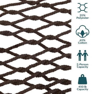 Kick back and relax in elegance with the addition of this traditional rope tree hammock for outside. This two-person hammock with wooden spreader bars provides a place to unwind after a long day and enjoy the fresh air with friends. The rope material is made from 65% cotton and 35% polyester material for comfort, style, and strength. Both cotton and polyester are long-lasting fabrics and require low maintenance and are able to resist the outdoor elements easily. The spreader bars are made from hardwood material that adds elegance and natural beauty to the space. Simply hang this backyard hammock between trees, posts, or purchase a 15 ft hammock stand (please note, a hammock stand is not included and must be purchased separately) to hang it up on the patio, porch, deck, yard, or campsite. Grab a friend, a good book, and some snacks, and enjoy the fresh air together all day long.