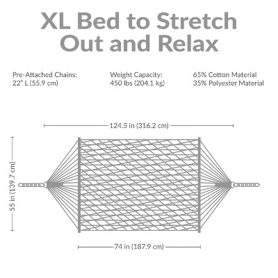- • COMFORTABLY FITS TWO PEOPLE: This large hammock measures 124.5″ L x 55″ W. This bed size is 74″ L x 55″ W. The pre-attached hanging chains are 12.75″ L. It has a heavy-duty weight capacity of 450 lbs.
