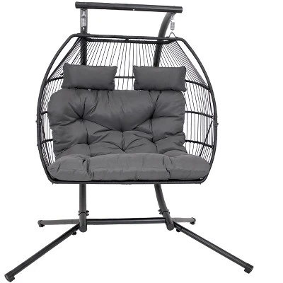 • PROVIDES COMFORTABLE RELAXATION: This patio swing chair with stand set comes with all the components for relaxing on the patio, deck, or backyard. The double seat chair comes with a steel stand, a seat cushion, and 2 headrest pillows for use anywhere. The cushions are secured on the chair with the attached fabric ties.