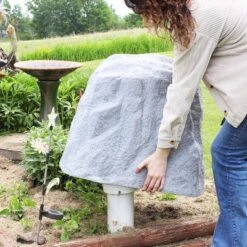 • HIDES LANDSCAPE UTILITIES: Place this fake rock cover over a septic tank, well, sprinkler valves, pipes, or other unsightly objects in the yard to create a natural look on any landscape. Push the stakes into the ground through the holes at the bottom of the rock to secure it over any object.