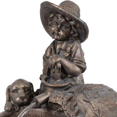 Add some country charm to any patio, garden, or yard with this elegant, solar powered water fountain with a battery backup. This fountain features beautiful detailing with the grass, flowers, and little boy with his dog fetching water at the water pump. Plus, no plumbing is required; once the feature is assembled, simply connect the cord from the pump to the solar panel and place the panel in direct sunlight. There’s mo more unsightly extension cords running across the yard and hogging those outlets. Simply mount and conceal the panel in a sunny place and enjoy! The rechargeable battery pack charges throughout the day (with or without the fountain running) so the gentle water sounds can be enjoyed in the evening as well. Place this stunning, detailed fountain anywhere and watch your space illuminate with soothing sounds and beautiful views.