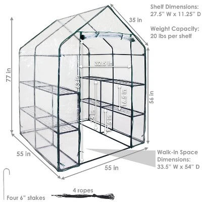- • PORTABLE GREENHOUSE KIT: Move this greenhouse across the yard or patio to ensure plants receive the best sunlight to grow. This walk-in greenhouse measures 55″ W x 55″ D x 77″ H and weighs 21.2 lbs. Each shelf is 27.5″ W x 11.25″ D and has a weight capacity of 20 lbs. The top shelf is 35″ from the ground, and the bottom shelf is 17.5″ from the ground on each side of the hot house. The door measures 32.5″ W x 63″ H. The walk-in area of this greenhouse is 33.5″ W x 54″ D x 77″ H.