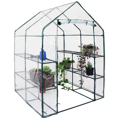 Have a successful growing season this year with help from this portable walk-in greenhouse! With four shelves for growing plants and storing supplies, this small greenhouse for outdoors is great for creating the right growing climate for vegetables, herbs, fruits, and flowers. This greenhouse is durably constructed with an iron tube frame and a PVC covering that is coated with a UV ray protective finish. The cover protects plants from inclement weather like frost, excessive heat, and moisture. The cover is transparent so light can filter through to ensure plants receive the right amount of sunlight. This greenhouse features four shelves that are made from steel wire to hold planters and keep supplies close at hand. Store the heaviest planters on the bottom shelf. A roll-up door with zippers allows for controlled airflow in and out of the greenhouse and easy access to plants.