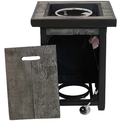- Square outdoor propane gas fire pit table with weathered wood look
