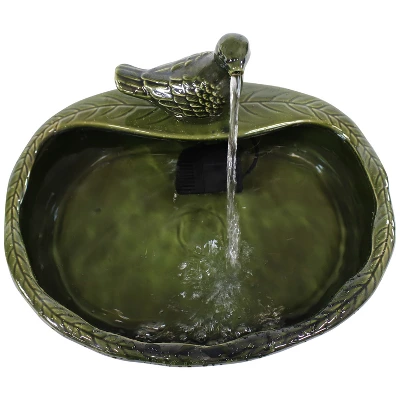 This glazed ceramic solar fountain is great for any patio, garden, yard, front porch, or other outdoor space, sure to add instant charm and joy. The glazed ceramic feature includes a green dove perched on the side of a green bowl. The glazed ceramic material makes this fountain resistant to the elements outdoors and has a shiny, elegant look. Make sure to bring indoors in freezing conditions so this adorable little water feature doesn’t crack or break. No plumbing is required. The water recirculates through the submersible pump in the basin and flows up and through the dove’s mouth back into the bowl again. With the solar pump and panel, simply mount and conceal the panel in a sunny place and enjoy!