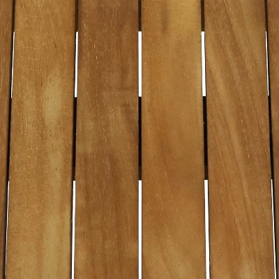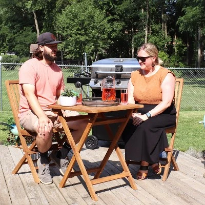 Easily enjoy friendly brunches, quick afternoon meals, good conversation, and relaxing accents with this outdoor, Nantasket style, 3-piece, teak wood folding outdoor bistro set. This set includes 1 square table and 2 armless, matching chairs. The chairs and table all feature a premium solid teak wood construction with a light wood stain finish for increased weather-resistance. During storms and high-moisture conditions, be sure to cover or bring this set indoors to ensure long-lasting use. The teak wood design also creates a natural and elegant feature to any space and is sure to complement any existing decor wherever desired. This bistro set can be used in any of your favorite places including the patio, deck, front porch, garden, or yard! The foldable design also makes this set easy to set up, take down, and store when not in use. Grab a glass of wine, a cup of coffee, or a good book as needed and enjoy your outdoor space effortlessly.
