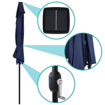 • LIGHT UP THE NIGHT: The outdoor half umbrella has 15 LED lights that are powered by the sun to illuminate any space at night. Sunlight is collected through the solar panel on top of the umbrella, and the LED lights located on the ribs of the umbrella are operated by a switch on the pole. The solar lights require 5-6 hours of direct sunlight to fully charge and will operate for approximately 4 hours.